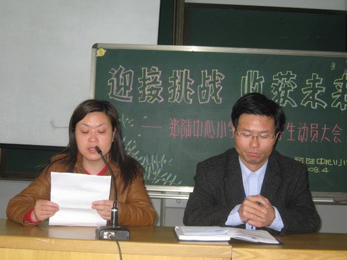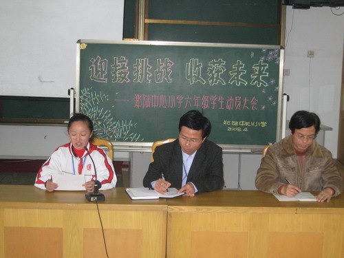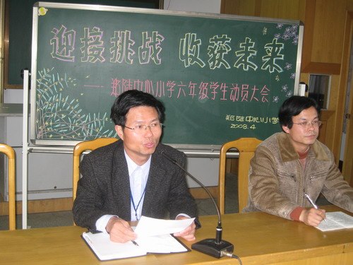 4月9日下午,在郑陆中心小学的阶梯教室,学生代表的发言拉开了六年级学生动员大会的序幕。会议由周刚主任主持,首先是三位学生代表的发言,交流学习体会,探讨学习方法,表露学习决心,认为课前认真预习,课堂专心听讲,课外加强复习、畅游书海是学习成功的关键。