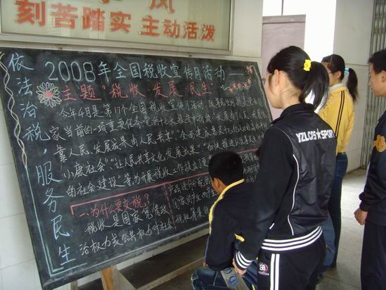 改善民生问题是党和国家当前的一项重要任务,党的十七大报告中指出:“发展为了人民、发展依靠人民、发展成果由人民共享”、“全面建成惠及十几亿人口的更高水平的小康社会”、“让人民共享文化发展成果”、“加快推进以改善民生为重点的社会建设”等,民生问题同时也是全社会关注的热点和重点。经济社会的发展是税收发展的原动力,税收与发展和民生息息相关。因此,2008年税收宣传月紧密围绕“税收·发展·民生”的主题,以“税收促进发展,发展为了民生”为主要内容。“税法宣传进校园”活动的目的是通过税法宣传活动的深入开展,让学生们从小树立遵纪守法、依法纳税、强国富民的意识,并通过向家长、社会的宣传,着力增强全体公民的依法诚信纳税意识和税法遵从度,构建和谐征纳关系,营造良好税收环境。