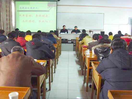 会议由江建林校长主持。首先,江校长代表学校党支部、校行政给予教工们新春美好的祝愿,其次又详细布置了最近几天的作息时间和工作安排。紧接着,江校长总结了去年该校所作的主要工作和开展的主要活动。如该校开展的青年教师形象技能大赛,受到一致好评。大赛分为上课、演讲、才艺展示三部分。27位青年教师经过精心准备,表现可圈可点、精彩纷呈,为全体教工提高专业技能,丰富业余生活搭建了平台。同时,江校长又围绕着“师德”和“成绩”,总结并肯定了该校取得的成绩,对大家提出了新学期更高的工作要求,希望全校上下一心,艰苦奋斗,再铸辉煌!