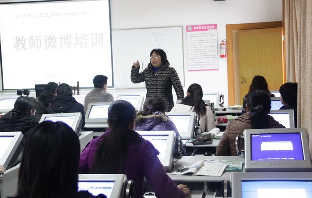 微博可以理解为“微型博客”或者“一句话博客”。您可以将看到的、听到的、想到的事情写成一句话(不超过140个字),或发一张图片,通过电脑或者手机随时随地分享给朋友。您的朋友可以第一时间看到您发表的信息,随时和您一起分享、讨论。李志伟主任从“什么是微博”、“为什么要建设微博平台”、“我们用微博做什么”三个方面展开培训内容。分别介绍了用户账号的设置,发送广播、新建话题、发布图片、粘贴视频的方法,以及评论、转播、删除、收藏等交互,找朋友、搜索、@功能的运用。老师们兴致盎然认真操作,最后分管的张惠芬副校长对