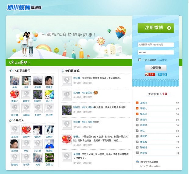 随着微博对社会生活的介入和渗透,其影响力正日益扩大,成为互联网上更新最活跃的信息源和舆论场。郑陆中心小学利用网上开源微程序自己动手搭建平台,打造郑小教师微博系统(http://{域名已经过期}), 在