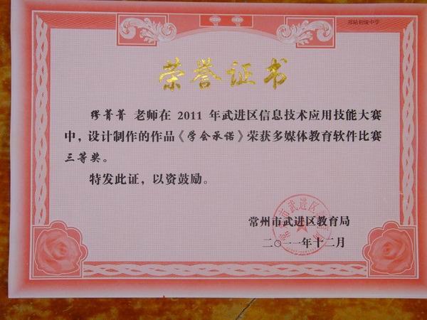缪菁菁在区信息技术应用大赛中设计的教育软件荣获“三等奖”