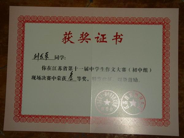 刘长荣江苏省第十一届中学生作文大赛中荣获“三等奖”