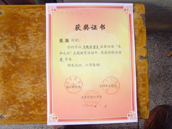 姜瑜在市第四届“生命之水”主题活动中获诗歌一等奖