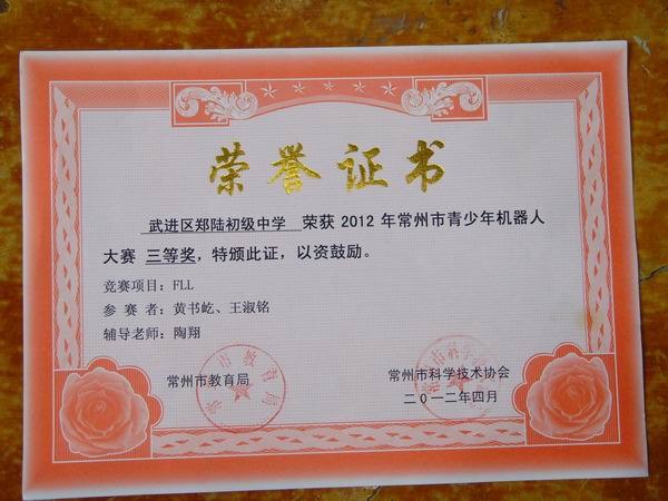 黄书屹、王淑铭同学荣获常州市青少年机器人大赛“FLL”项目“三等奖”