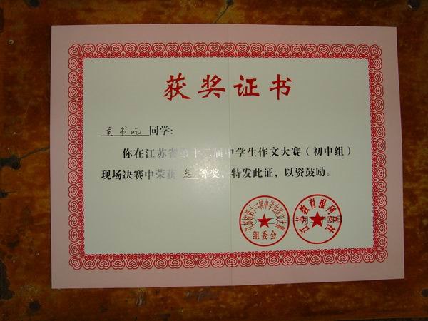 黄书屹在第十二届江苏省作文大赛中荣获三等奖