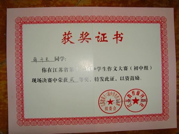 薛开来在第十二届江苏省作文大赛中荣获二等奖