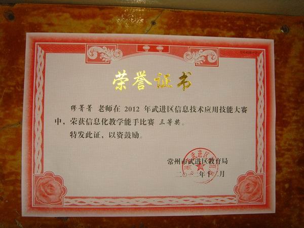 缪菁菁老师在2012,12武进区信息技术应用技能大赛中,荣获信息化教学能手比赛“三等奖”