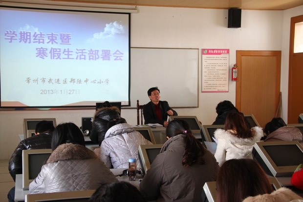 岁去年来新换旧;龙潜蛇舞景成春。1月27日下午,郑陆中心小学在三楼网络教室举行了学期结束暨寒假生活部署会。郑陆中心小学、郑陆南苑小学全体教师参加了会议。钱国云校长主要从期末教学质量的分析、奖励性绩效工资的说明、寒假教师生活的要求等方面进行了部署。