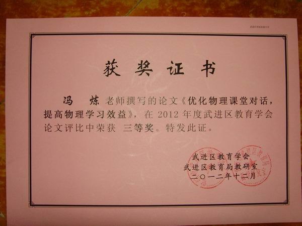 冯炼老师的论文《优化物理课堂对话 提高物理学习效益》被评为区教育学会论文“三等奖”