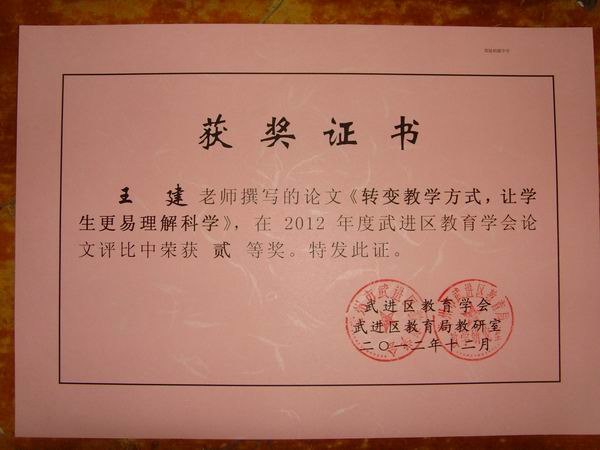 王建老师的论文《转变教学方式,让学生更易理解科学》被评为区教育学会论文“二等奖”