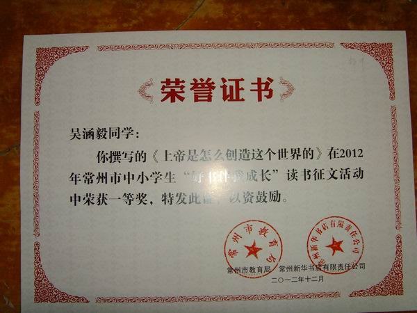 初一(1)班吴涵毅同学 在“好书伴我成长”中荣获“一等奖”
