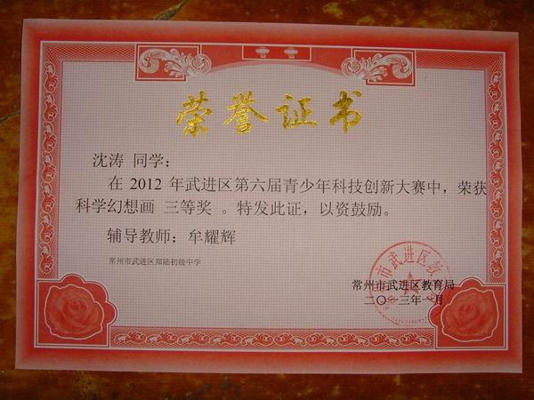 初三(3)班 沈涛 同学 在区第六届科学创新大赛中荣获“科学幻想画”“三等奖”