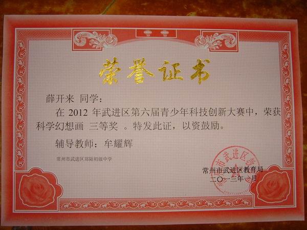 初三(2)班 薛开来 同学 在区第六届科学创新大赛中荣获“科学幻想画”“三等奖”