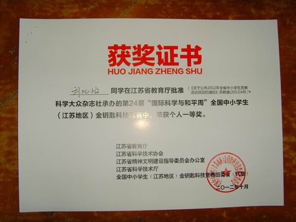 初三(2)班 刘沁怡 同学在江苏省第二十四届“国际科学与和平周”“金钥匙”竞赛中荣获“一等奖”