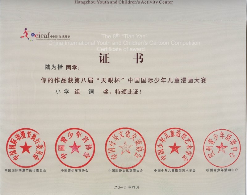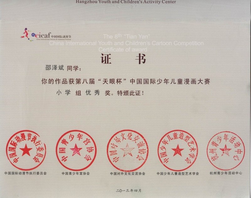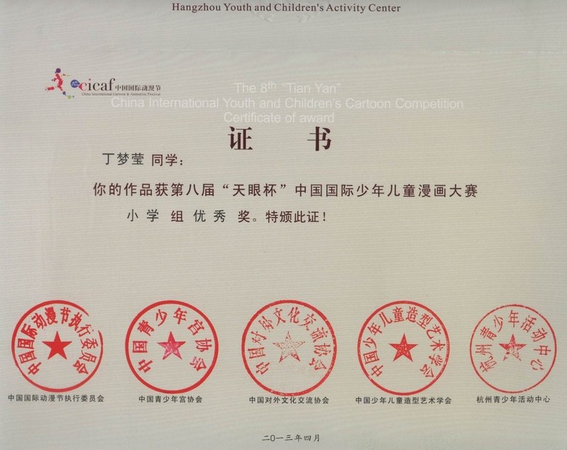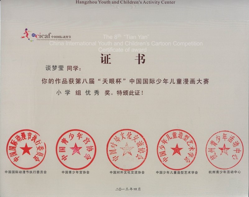 由中国国际动漫节执委会、中国青少年宫协会、中国少年儿童造型艺术学会、浙江省人民出版社、杭州市人民对外友好协会主办,杭州青少年活动中心承办的第八届“天眼杯”中国国际少年儿童漫画大赛从2006年举办至今已有八届,本届大赛,共收到作品34260余件,参赛的作者国籍覆盖了五大洲39个国家和地区。