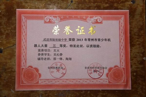 二(6)班吴沁静同学荣获常州市机器人大赛“灭火”三等奖