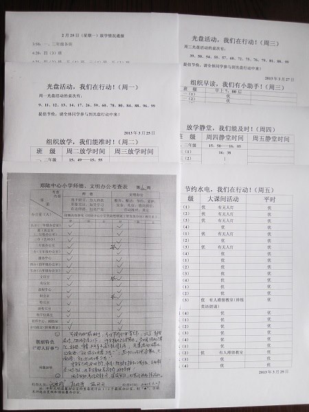 一学期,值周领导老师在工作中积极参与,主动担当,以主人翁的态度参与学校的管理,为校园安全、文明、有序做出了自己的贡献。值周工作已成为学校一道亮丽的风景线,成为学校对外展示教师风采的一个窗口。值周领导老师对于学校一周工作有翔实的记载,包括当周呈现的靓丽特色(好人好事)和需整改的问题。当班值周每天有检查内容,如:光盘行动、放学时间静堂时间、抽查有无人灯、早晨学生到校早读纪律等。放大镜里找好人好事,显微镜里现小问小题。