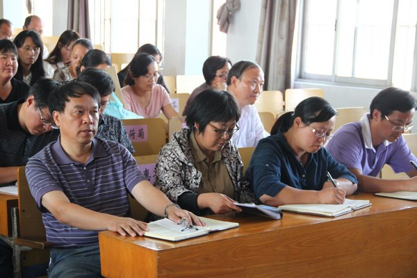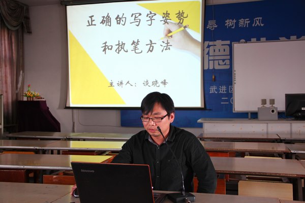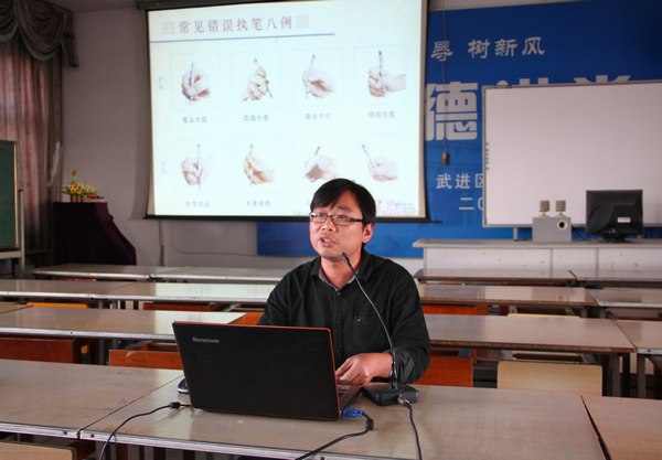 谈晓峰老师则与大家分享正确的执写字姿势和执笔方法的研究,谈老师应用PPT多媒体呈现和示范操作相结合,讲解了正确的硬笔和软笔的执笔方法,特别是学生日常硬笔执笔中的八种错误:笔尖太低、四指分家、靠点不对、拇指包笔、关节突出、毛笔姿势、勾腕执笔、抱拳锄地等,指出学生写字姿势不准确,轻者影响写字质量,养成不良书写习惯,重者影响生长发育、你利于身心健康。让学生体验正确的坐姿及握笔姿势,学生就容易改变掉不正确的书写姿势。谈老师的讲座听起来亲切自然,有说服力,使在场教师受益匪浅,
