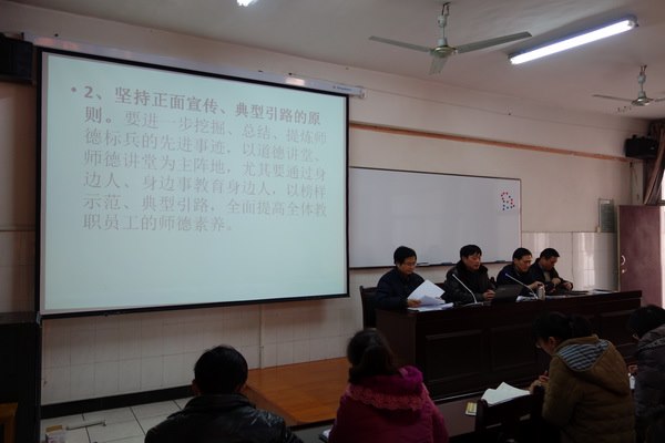 今天下午3:20,郑陆初中在行政楼3楼多媒体教室召开了“为人师表,争做三好老师”师德建设动员大会。本次会议由学校钱朝平校长主持。郑陆初中全体教职工,教育局组织人事科钱建华、巢拥军参加了会议。