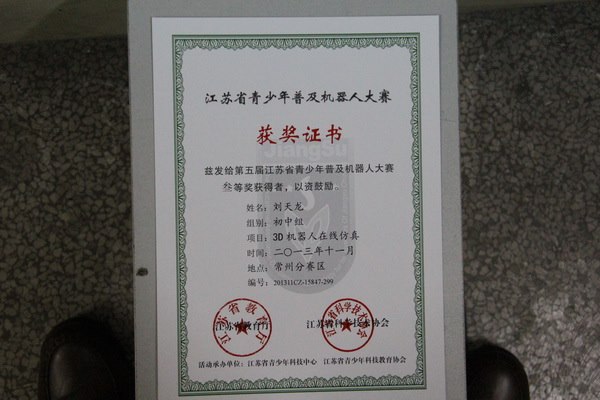 初二(3)班的刘天龙同学在江苏省青少年普及机器人大赛中,荣获“3D机器人在线仿真“项目三等奖