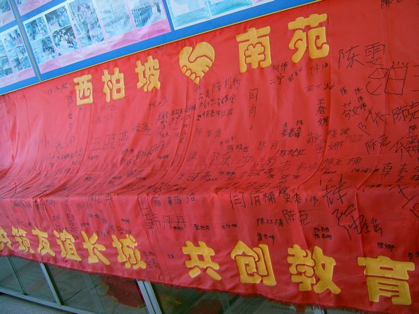 武进区南苑小学(合并前为武进区南城小学)与西柏坡希望小学的“手拉手”历史悠久,1990年,原武进区南城小学在老校长戴国方老师的带领下,率先响应《中国少年报》的倡议,与河北省平山县西柏坡希望小学结对手拉手。这友谊一结就像一棵茁壮成长的树木一样,逐渐枝繁叶茂,生生不息,直到今天,友谊之花越开越艳。原南城小学组织了60多次主题活动,现在的南苑小学组织了10多次活动,先后10多次共向西柏坡希望小学赠书3000多册,总价值约7000元,报刊800多份,直接捐款则达5000元左右。两校“手拉手”,学生之间“广交天下友,信中看世界”,学校之间是教育教学活动的交流,十余年间,两校师生书信往来达近千封,互赠自制贺卡、照片300多份,读书笔记400篇左右,另有大量的试卷和书籍。这不仅在两校间开展起比学习、比手巧的竞赛,而且也成为我们两校思想教育的宝贵财富。由此,南苑小学被省青少年发展基金会、省希望工程办公室授予“江苏省希望工程20周年‘特殊贡献奖’”。