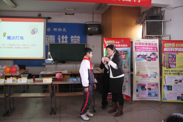 “抬不起来的左脚”、“魔法灯泡”、“气球对抗赛”、“不怕火的气球”、“刺不爆的气球”、“吹口气把你抬起来”、“盛开的纸花”、“悬浮水龙头”、“热动力喷泉”、“浮沉章鱼”等种类各异的玩具或实验,使得孩子们一次又一次吃惊地睁大了眼睛;一次又一次发出了啧啧的赞叹声;一次又一次的互动更使得孩子们兴致勃勃。