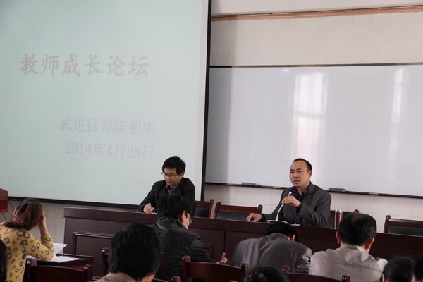 2014年4月28日下午两节课后,武进郑陆中学于学校多媒体教师召开了“关注教师成长,学会智慧管理”的教师成长论坛。会议上,去苏州进行班主任培训的沈亚南和钱叶星老师和大家分享了自己的培训心得。