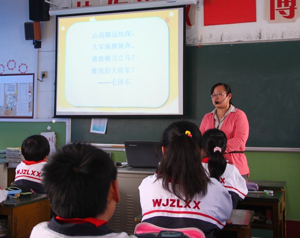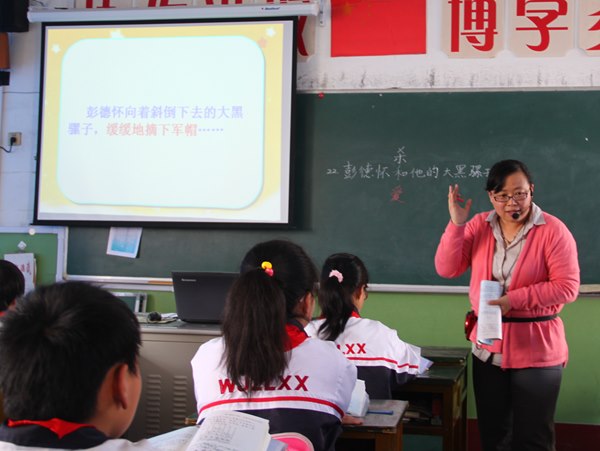 此次活动由邱金兰副校长展示五年级语文教学。邱校长从教二十多年来,行政岗位不断发生变化,但是对于语文教学的热爱从来没有因此而改变。她善于激发孩子们的学习兴趣,注重培养良好的课外阅读习惯,课堂常常充满变化之美。这回,她执教的是《彭德怀和他的大黑骡子》的第一课时。摒弃繁枝缛节,大胆改变常规,新课伊始,邱校长和孩子们一起诵读了毛泽东所写的六言诗——《给彭德怀同志》:山高路远坑深,大军纵横驰奔。谁敢横刀立马?惟我彭大将军!真是未成曲调先有情。在预习的基础上,孩子们初读课文后首先了解了文章的主要内容,紧接着,就围绕“从哪些句子读出了彭德怀对大黑骡子的爱”这个问题展开自读、自悟。每一处神态的描写,每一个细节的刻画,邱校长引导孩子抓住关键语句,在交流中用心涵泳、细心体会,在讨论中练习表达、真情感悟。在深深地感受到彭德怀对大黑骡子的爱之后,孩子们自然而然产生了新的疑问:“既然这么爱大黑骡子,那为什么又要下令杀掉呢”?而这正是下堂课的伏笔。所谓在美好之处戛然而止,让人对下堂课充满期待。当然,虽然是高年级的第一课时,但是写字教学不容忽视,在课尾,邱校长和孩子们一起练习了“彭” 字的书写。