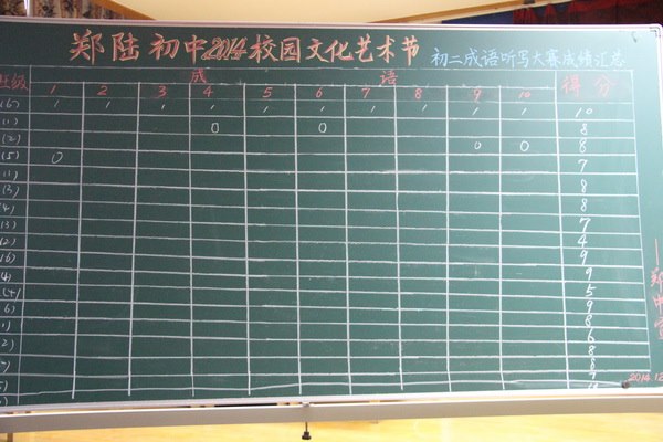 12月30日,郑陆初中政教处和初二语文组联合举办了初二年级学生成语听写大赛,大会由初二年级的语文组吴赛花老师主持,听写比赛开始前,政教处的毛刘红老师宣布了比赛规则。赛前初二年级组已经为这次大这赛准备了500多个成语供各班学生背诵,各班经过初赛,选出了参加整个年级大赛的选手,年级比赛通过抽签的方式来决定听写的顺序,并由吴老师宣读成语,参赛的学生把成语写在黑板上,每位学生写十个成语,并根据正确率和书写时间来决定名次,由于参赛学生准备充分,所以竞争非常激烈,经过一个多小时的激烈角逐,最后决出了一等奖、二等奖和三等奖,其中,初二(3)班的陈丹丹、初二(6)班的吴怡平荣获一等奖;初二(2)班的王小玉、二(6)班的秦萍、二(4)班的李小宇荣获二等奖;初二(1)班的汪晓燕、李雅莉、二(2)班的苏天祎、二(5)班的陈钰、二(6)班的顾蕾蕾荣获三等奖。