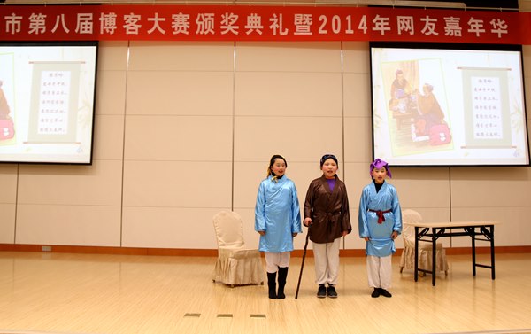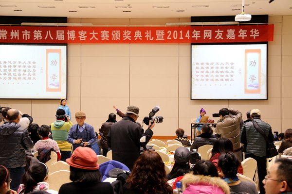1月31日 下午,一年一度的龙城网络盛事——常州市第八届博客大赛颁奖典礼暨2014年网友嘉年华在常州报业传媒大厦圆满落幕。民俗专家、知名记者、网络编辑、作家学者、企业家、学生、官员……都化身成为一名名普普通通的网民,他们用网络世界里彼此熟悉的称呼在现实的世界里互相问候、交流、探讨。颁奖会现场,300余名各界网友相聚一起。不仅有各类奖项的颁发,还有博友们精彩纷呈的节目表演。