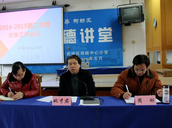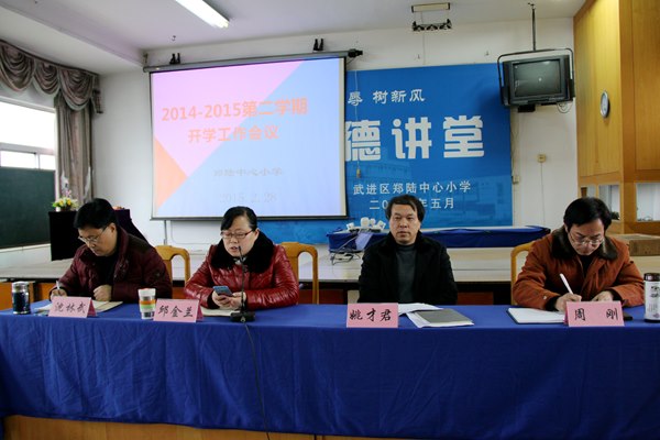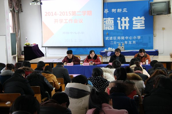 骏马腾飞迎福至,灵羊起舞报春来。2015年2月28日下午,郑陆中心小学在四楼阶级教室召开新学期开学工作会议,共同畅想新学期的规划与部署,为新的征程扬帆起航。郑陆中心小学、南苑小学全体教师齐聚一堂,会议由周刚副校长主持。