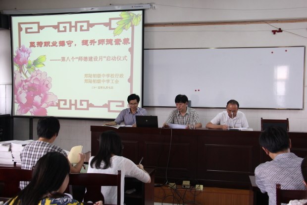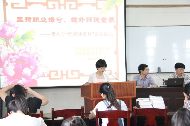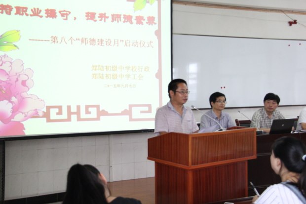 为认真落实天宁区教育文体局《关于开展第八个“师德建设月”活动的通知》文件精神,2015年9月7日下午,郑陆初级中学全体教师齐聚本校多媒体教室,举行第八个“师德建设月”启动仪式。
