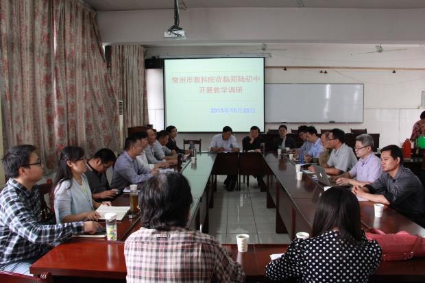 10月20日,秋高气爽,桂花飘香。常州市教科院张 春副院长带领15名教研员来到郑陆初中,开展教学调研。天宁区教育文体局陶局长、刘科长等领导陪同调研。