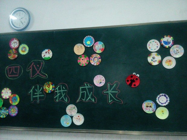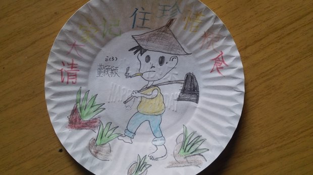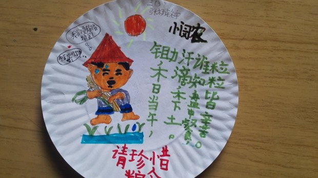 生日庆祝会上多余下的蛋糕餐盘,往往是丢入垃圾桶的多。一、二、三年级的孩子们把这些小小的餐盘充分利用,用自己灵巧的双手,在洁白的餐盘上描描画画,绘制出了一幅幅精美绝伦的餐盘画。孩子们说:我们要感谢赐予这一切的人和物,不能浪费。小小的餐盘经过孩子们的精心制作,仿佛赋予了生命一般,一张张张贴于黑板上,成为教室里一道亮丽的风景线。而其他年级的以“感恩”为主题的黑板报,更是通过孩子们的手,把他们的心声化成鲜艳、美丽的粉笔字。精心设计,细致描绘,孩子们用心在书写,用情在抒发。