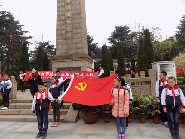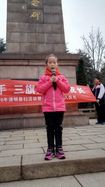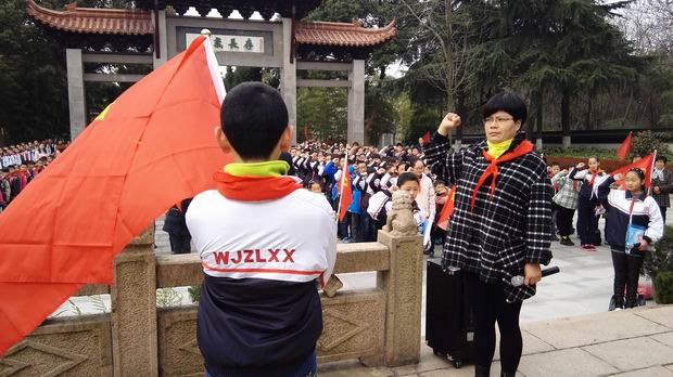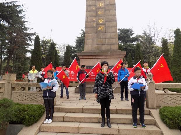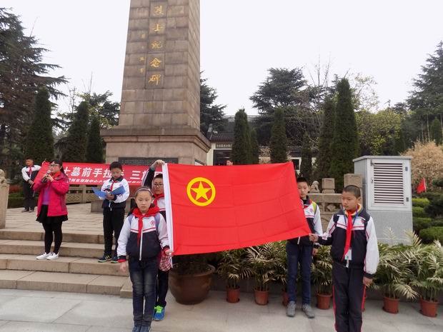 烈士墓前三旗同辉,鲜艳的队旗下,大队委主席黄若瑄同学带领着新队员们进行了自豪宣誓。庄严隆重的氛围中,四名优秀学生代表虔诚地向烈士纪念碑敬献上花圈。在星星火炬的队旗下,在“时刻准备着”的呼号声中,入队仪式圆满结束。