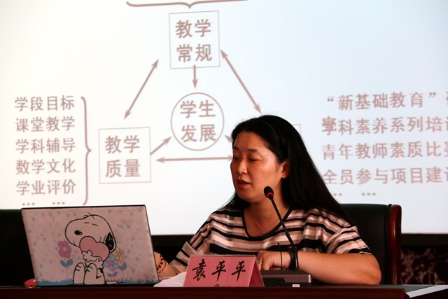 袁主任首先道出了教研组、备课组组长的心声:繁、杂、忙、难。如何改变这种现状呢?袁老师主要从两面做了具体的介绍:第一,如何协调忙乱的“事务”?第二,研什么?怎么研?那么如何协调忙乱的事务,秘诀就是让人人都成为责任人。学校管理重心下移,从工作布置走向工作研讨,多听群众意见,多和老师沟通交流,让每一位教师形成价值认同,即做一名优秀的合作者,由单一角色向双重角色转变。当每个人都成为责任人之后,就会对别人的工作多一份理解,多一份支持。当一种制度被教师认可,它就能朝着好的方向发展。“成事中成人”,这是学校管理的目标。那么,研什么,怎么研,则要落实十二字“方针”:摸家底、找差距、定目标、寻发展。把课堂还给学生,围绕专题整体推进,立体网状序列化推进,是三个发展时期的不同工作重点,正是在这样一个不断探索、调整的过程中,每一位教师获得了归属感、荣誉感、责任感。而要打造一个优秀的团队,帮助教师得到更好地发展,教研组、备课组组长应当努力做先行的思考者、学科的带头人、同班的欣赏者、智慧的引路人。