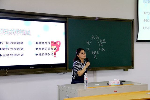 之后,许老师还做了题为《绘本里的童年,童年里的绘本》的讲座。她从大陆和台湾两地的绘本教学差异谈起,告诉老师们什么是绘本,如何来阅读绘本,探讨绘本的价值。还具体介绍了绘本教学介入的三个途径:教材的有机补充、生活的文学拓展,单纯的主题推荐。她希望语文老师们一起走上绘本阅读教学之旅。