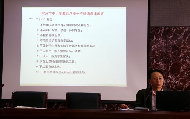 首先,教师中心李志伟主任与全体教师一起学习了《中小学教师职业道德规范》、《2014年国家教育部六条禁令》、《常州市中小学教师八要十不师德自律规定》等三个文件,要求老师们对照师德标准,认真反思,认真查找,深入剖析,填写好师德师风自查自纠情况表。