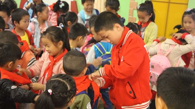 在须老师热情洋溢的的话语中,别开生面的入队礼拉开了帷幕。二年级小朋友精神奕奕的出旗为本次仪式开了好头,随着须老师宣布254名一年级小学生被批准加入中国少年先锋队,正式成为光荣的中国少年先锋队队员,现场掌声雷动。一年级中队辅导员老师郑重地接过须老师手中的红领巾,二年级小朋友作为老队员为新队员们佩戴上鲜艳的红领巾,并对这些新队员们送上了珍贵的祝福语。三旗传递,交相辉映,是精神的展示,更是精神的传承交接。队员们个个神采奕奕,在火红的队旗下骄傲地挺起胸、握紧拳,跟着须老师进行庄严的宣誓。一(3)班小朋友谈知霖作为新队员代表发言,表达了入队后的喜悦心情,也表示以后将更加勤奋学习、勇于进取、无私奉献,争做优秀少先队员,最后入队礼在队员们“时刻准备着”的呼号声中圆满结束。