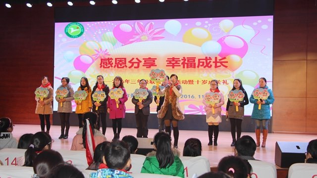 11月24日,2016年的感恩节。这一天,郑小三年级的全体少先队员和他们的老师、家长一起度过了一个难忘的十岁成长礼。开心的微笑,愉快的歌声,欣慰的目光、感动的泪水,幸福像空气一样弥漫在活动现场;充满敬意的鞠躬,饱含深情的讲诉,庄重响亮的成长宣言,感恩如雨丝一般滋润着每个人的心房。姚校长代表全体老师送上了情深意长的致辞,他告诉孩子们感恩是爱最好的表达,希望孩子们心怀感恩、努力学习、锻炼体魄、健康成长。《幸福拍手歌》嗨翻全场,童声朗诵声声清亮;孩子和家长们互赠祝福卡和感恩卡,感动的拥抱和激动的泪水融化全场,字字真情的感恩贺祝福,满溢着浓得化不开的母子情意。