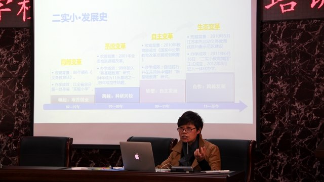王校长从三个方面介绍了二实小在“新基础教育”研究实践背景下,进行学校主动发展研制、实践、评估的过程。第一,研制——借势而动聚合力。1999年二实小成为常州市第一所研究实践叶澜教授的“新基础教育”的项目学校,在 “知难而上、执着追求、滴水穿石、持之以恒、团队合作、共同创造、实践反思、自我更新”的“新基础教育”研究精神理念引领下,二实小获得了学校的新转型和大变革,学校内生力得到有效拓展;校长团队、中层团队、教师团队的思维方式得到了新型引领,在课程、课堂、学生多维度理顺发展思路和探求价值思考,从而最终惠及学生成长发展。第二,实施——乘势而上自奋蹄。王校长从实施平台、实施目标、实施策略等角度来切入话题,提出了整体与重点并重、成事与成人共赢的口号。她强调,学校发展需要从上至下地推行实施架构,需要全体教职员工都成为学校管理不可或缺的一份子。在教学上,教师个体首先应成为本学科的专家,同时又不能成为其他学科的门外汉,而做到一专多能。王校长还分享了她的“校长跟踪日志”,提出管理者团队要改变思维方式,要提升课程理解,要拥有专业气质,要把管理当专业来学。第三,评估——造势而为谋新略。王校长引领大家进行价值思考:学校主动发展是为了谁?是为了成事、成人、成机制、成文化。学校发展规划是“点、线、面、体”,即发展的支点、航线、局面、有机体。