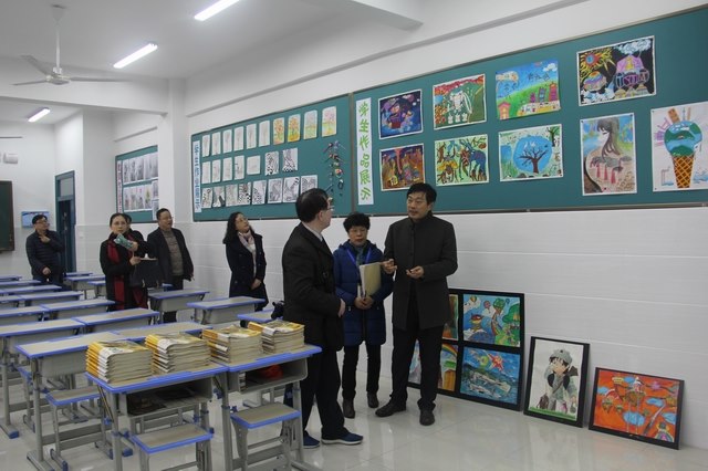 李督学带领评估组一行,重点查看了化学实验室、生物实验室、物理实验室、史地教室、云教室、美术室、科技活动中心、劳技室、微机室、音乐室、录播室、图书馆等功能室。在史地教室,评估专家饶有兴致地听取了李督学对该教室现代化设备的功能、平时的使用情况的生动介绍。在美术室、科技活动中心等功能室,评估专家对所展示的学生作品赞赏有加。