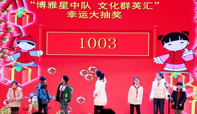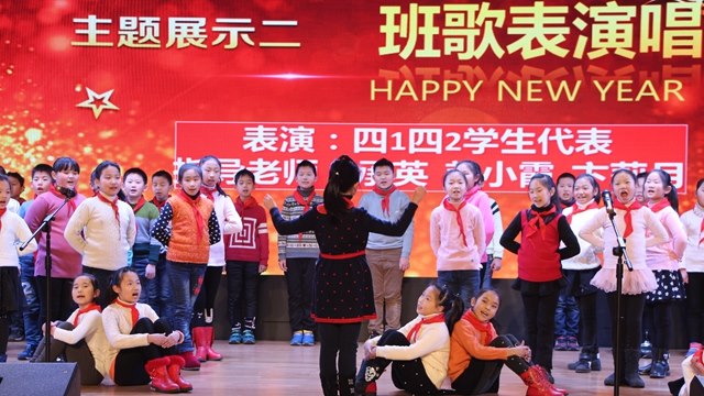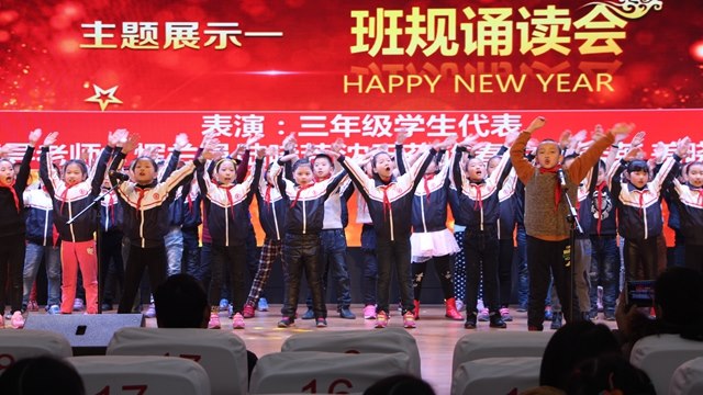 围绕着“班规诵读会”、“班歌表演唱”和“班级文化秀”三个主题,一至六年级各中队以丰富多彩的方式展示了一个学期以来班级文化建设的成果。汇演过程中,不时有惊喜出现——校长室的三位大朋友为孩子们送上了甜蜜的新年礼物;现场以小鸡玩偶投票的方式,选出孩子们最喜欢的节目,并及时颁发了“最佳人气奖”;热火朝天的幸运大抽奖,更是把活动推上了高潮。