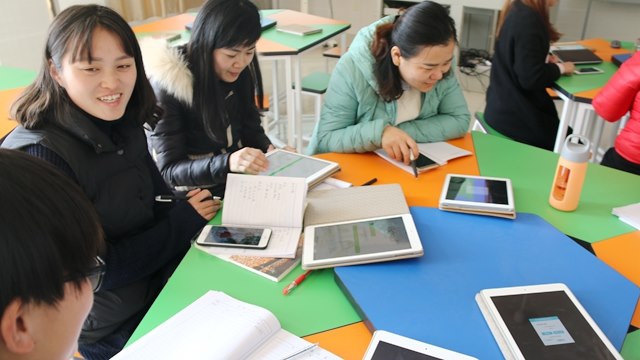 数字化学习既是一个自我改变的过程,又是一次新奇探索的旅程。参与的老师们有了很多全新的感受和认识,也有很丰富的收获。项目团队中的数字化学习先行者与大家分享了自己在学习课堂中的收获、感悟与思考。吴晓亚主任为大家讲述了互联网+环境下语文堂教学的备课、上课的实践过程,课前的网络互动与点赞,课中应用尚学互动系统即时互动与交流,演示了尚学平台所具有的交互式富媒体编辑功能。张丽花老师则向大家展示了互联网+环境下的英语课堂教学,以智动课堂、QQ、有道、百度等软件为支撑,利用学酷i信平台,让学生通过小组合作选择完成学习任务,充分提升了利用新技术和新工具自主学习的能力。