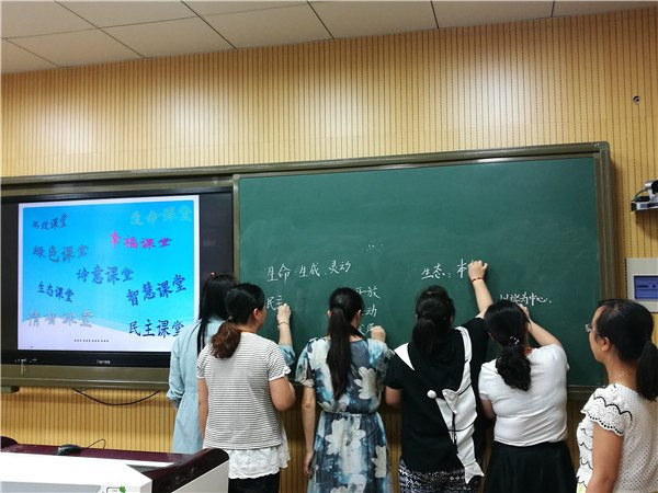 活动由课程中心蔡红主任主持。青年教师成长营的老师和特邀嘉宾邱金兰副校长、徐小琴、袁平平老师共同参与了此次沙龙活动。首先,大家一起罗列了课改以来涌现的各种各样的课堂——生命课堂、生态课堂、绿色课堂、智慧课堂……,蔡主任概括介绍了每一种课堂的代表人物和著作;然后,老师们把自己想到的这些课堂的本质特征写到黑板上,于是,我们看到了这些词:开放、互动、生命生成、灵动、以生为本……围绕这些核心特征,大家分享了自己或实践或学习到的精彩课堂:恽洁老师率先交流,她从外出学习印象最深刻的一堂课谈到自己本学期接连两次在局小袁平平、蒋敏杰主人帮助下的磨课历程,强调了“开放”、“智慧理答”;羌凌霞主任接过话题,畅谈了刚刚结束的互联网+英语项目中的收获,深刻感受到“如何真正开放”是需要不断探索的命题;紧接着,科学李新大老师、英语潘琦老师、数学王姣老师从不同学科不同角度讲述自己的实践心得和学习感悟。数学学科主任范建忠、王亚青、张丽花、芮红云、刘秋燕等老师也有感而发,纷纷表达了自己的思考。