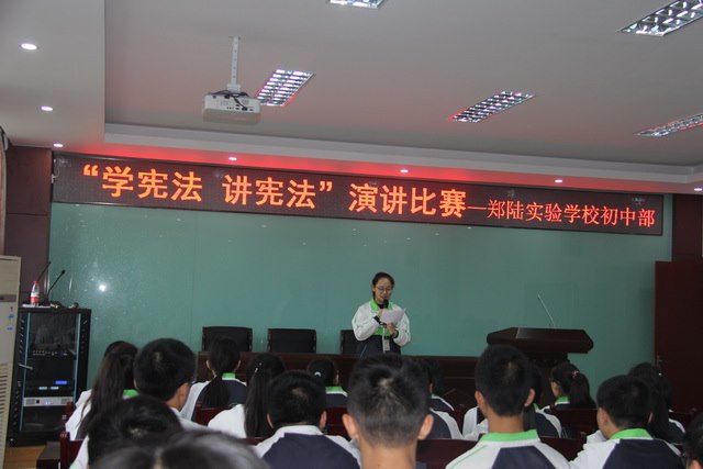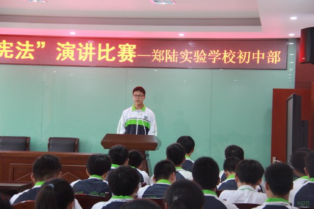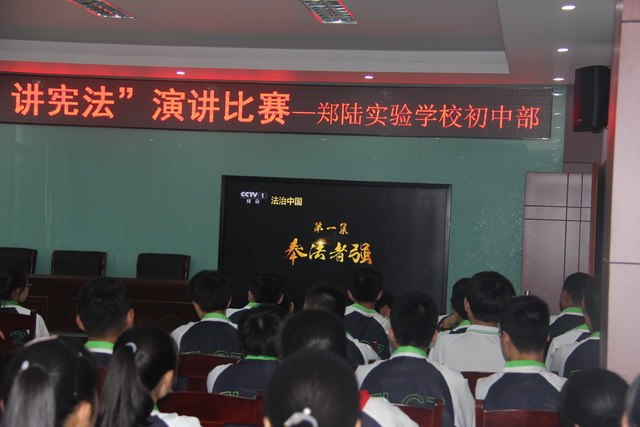 为弘扬宪法精神,广泛开展宪法宣传教育活动,使全校学生深入了解宪法、尊崇宪法,增强法治观念,引导学生形成“学法、知法、守法、护法”的意识。并根据各级行政部门的文件精神,坚决贯彻落实《青少年法制教育大纲》的要求,郑陆实验学校(初中部)在三个年级中开展了以“宪法在我心中”为主题的“学宪法讲宪法”演讲比赛。