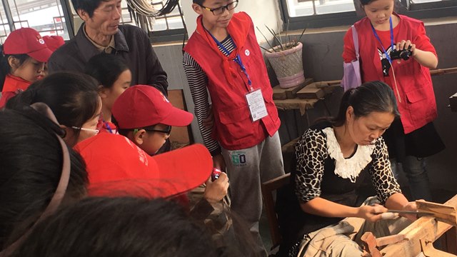 沿梳篦厂入口,走到尽头右拐,是一个留青竹刻展示区,这里陈列着我国著名留青竹刻大师白士风及其传人的珍品。留青竹刻,即用竹子表面青皮雕刻图案,把图案之外的青皮铲去,露出竹肌。留青雕刻的笔筒、臂搁、匣盒、扇骨等器物雕刻方法不仅精巧,而且竹器外表色泽莹润,经常抚玩摩挲,年代越是久远,竹肌颜色越是深沉。听馆长介绍说,一件作品至少要一到两个月的时间才能完成,而且特别费眼力,小记者们纷纷吐舌咂嘴。这可是需要十万分的耐心,能够坐得住,沉下心才能出成果的。