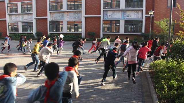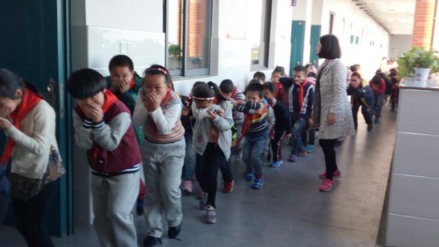 11月9日下午3:30,各班学生都沉浸在正常的学习和活动中,警报声骤然响起,上课老师和学生一惊,马上停止学习和活动。听到广播中紧急播报:“请老师和同学们注意,现教学楼发生火情,请各班组织学生准备撤离!请各班组织学生准备撤离!”急剧的警报声再度响起,学生在老师的组织下,弯腰下蹲,用衣袖捂鼻,沿墙按照预定的疏散路线,开始有序撤离……小学部全体师生45个班级共两千余人,快速撤离教学区,抵达事先指定的运动场集合,耗时2分钟50秒。