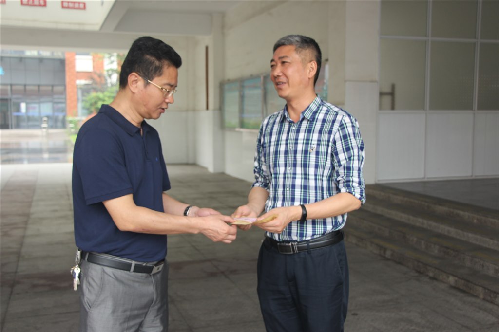 5月31日,镇党委杨康成书记、章仕杰副书记等领导冒着雨来到学校慰问老师,并祝老师工作顺利,学生节日快乐!同时赠送了慰问金。